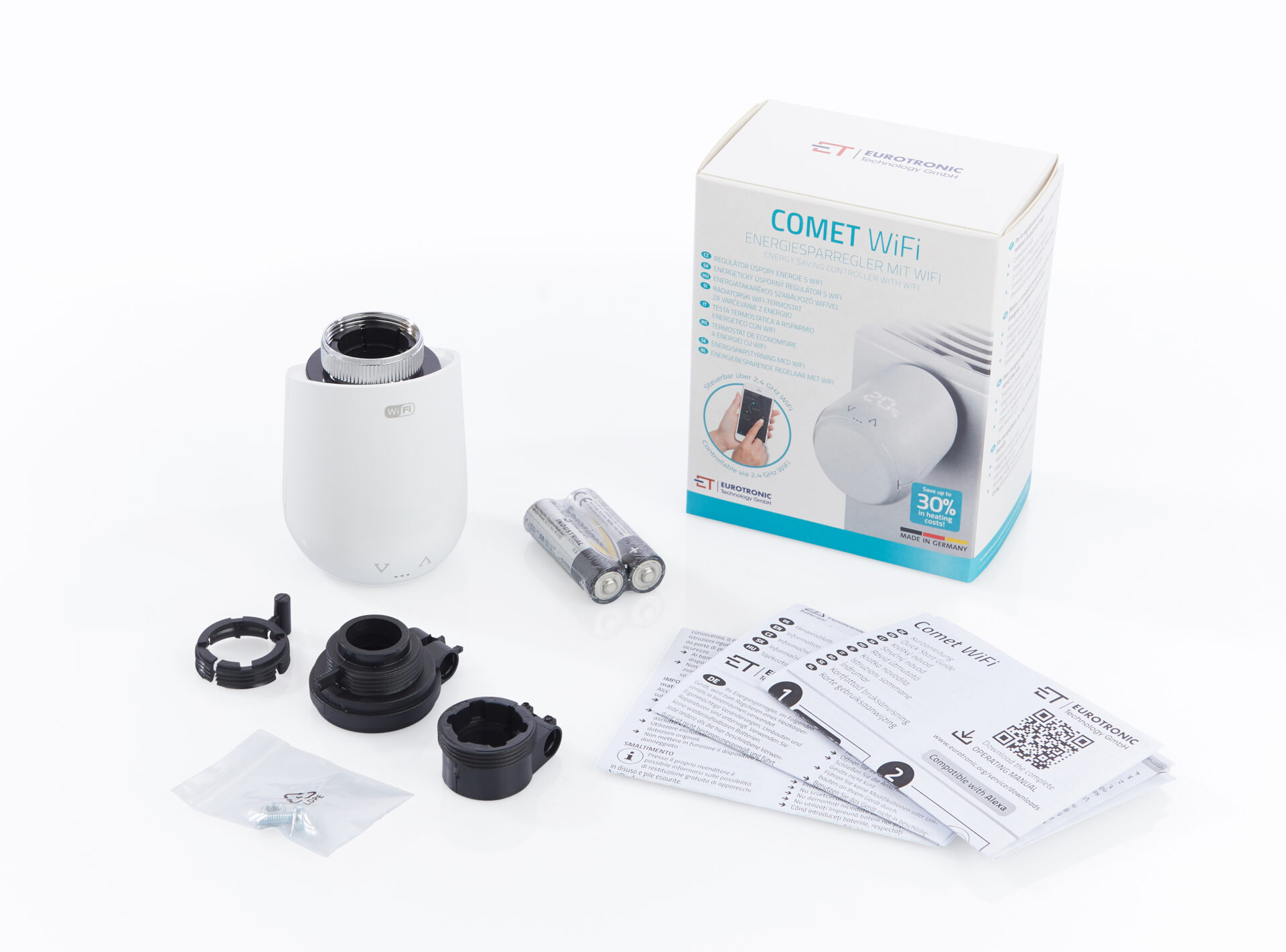 Comet WiFi revolutioniert den Markt der elektronischen Funk-Heizkörperthermostate mit neuartigem Design und bisher nie da gewesener Funktionalität. Durch den Funkstandard WiFi lässt sich das Thermostat in jedes 2,4 GHz WLAN-Netzwerk einbinden (erfolgreich mit 190 Access Points/WLAN-Routern getestet) und kann anschließend von überall aus gesteuert werden. Es wird kein zusätzliches Gateway mehr benötigt. Laden Sie sich einfach die Eurotronic App aus dem Store herunter und steuern und konfigurieren Sie Ihr Thermostat anschließend bequem über die nutzerfreundliche App.