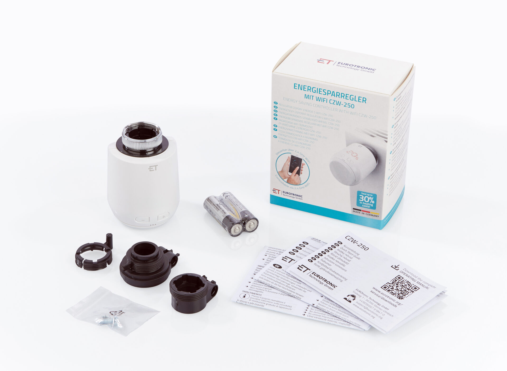 Comet Zero WiFi CZW-250 revolutioniert den Markt der elektronischen Funk-Heizkörperthermostate mit neuartigem Design und bisher nie da gewesener Funktionalität. Durch den Funkstandard WiFi lässt sich das Thermostat in jedes 2,4 GHz WLAN-Netzwerk einbinden (erfolgreich mit 190 Access Points/WLAN-Routern getestet) und kann anschließend von überall aus gesteuert werden. Es wird kein zusätzliches Gateway mehr benötigt. Laden Sie sich einfach die Eurotronic App aus dem Store herunter und steuern und konfigurieren Sie Ihr Thermostat anschließend bequem über die nutzerfreundliche App.